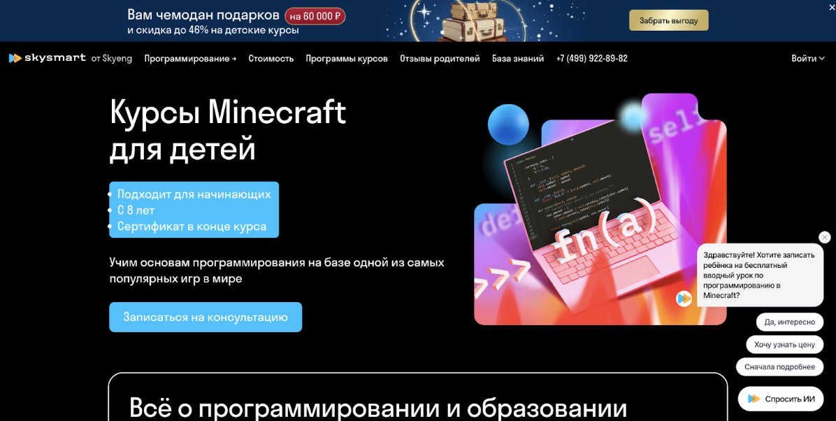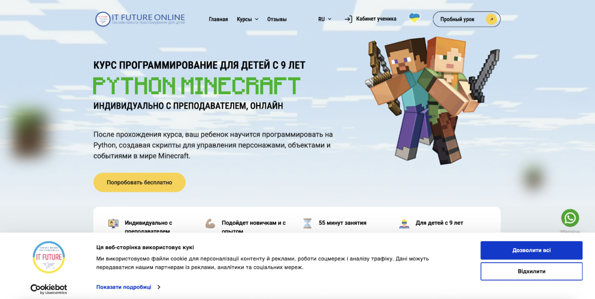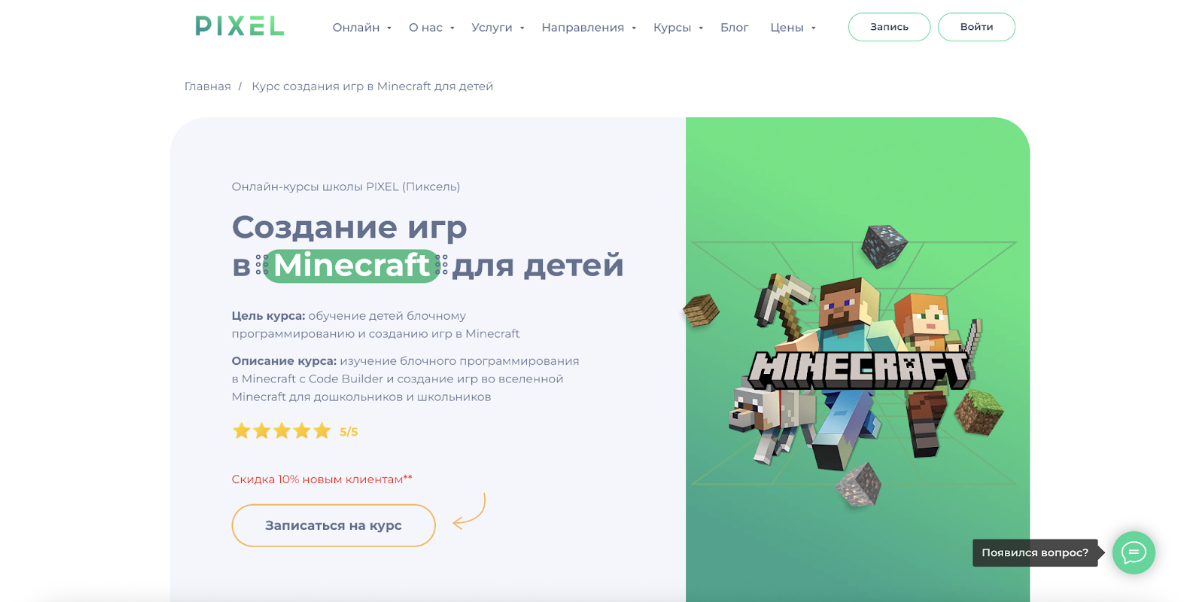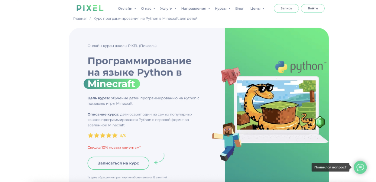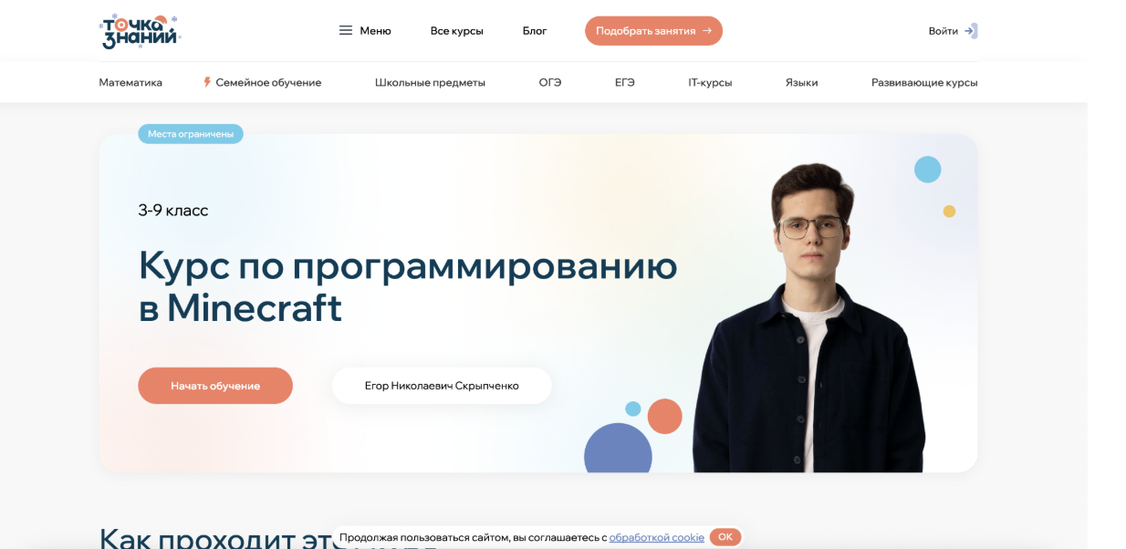 Кратко о курсе: Курс построен на обучении основам программирования через игровую среду Minecraft. Формат ориентирован на детей, которые только начинают знакомство с кодингом или испытывают трудности с информатикой в школе. Обучение проходит в игровой форме, без перегрузки теорией.