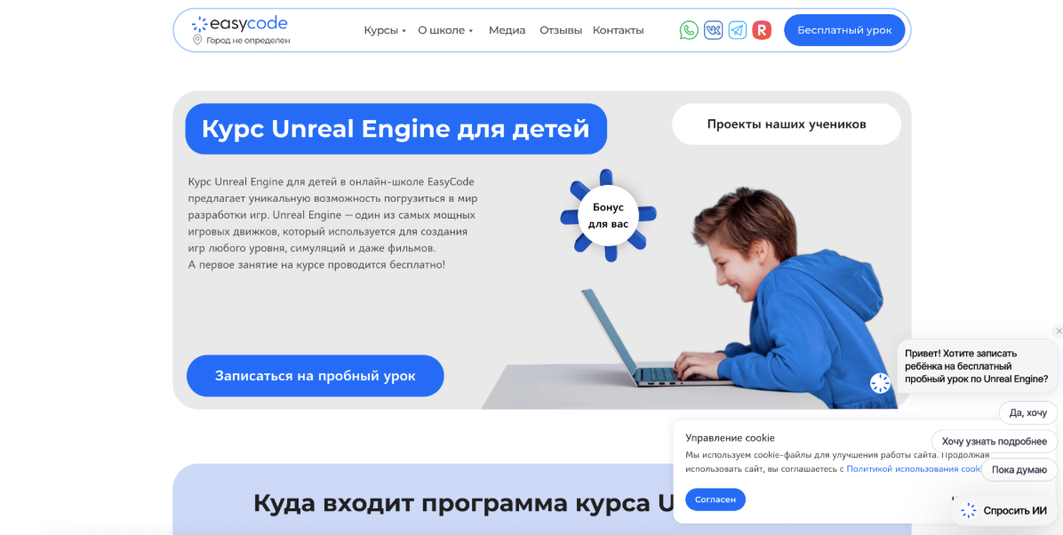 Как проходит обучение: Занятия включают теорию по игровому движку, практические задания и работу над игровыми проектами. Школьники постепенно осваивают инструменты Unreal Engine и создают свои игры, которые демонстрируют другим участникам курса. Первое занятие предлагается бесплатно, чтобы ребёнок мог оценить формат обучения перед покупкой полного курса.