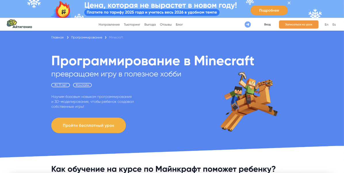 Кратко о курсе: Курс предлагает лёгкий вход в программирование через игру Minecraft. Обучение построено по принципу «от простого к сложному»: от визуального программирования и базовых алгоритмов к созданию собственных мини-игр и автоматизированных сценариев.