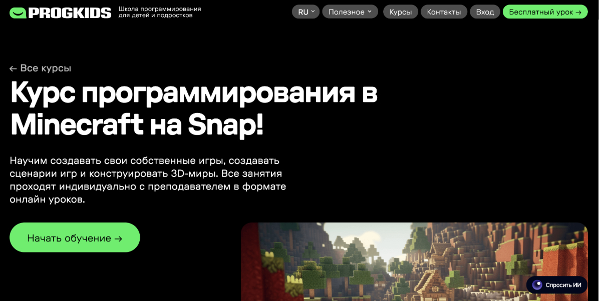 Кратко о курсе: Курс знакомит детей с основами программирования через игру Minecraft, используя визуальное блочное программирование в среде Snap!. Обучение построено от простых понятий к созданию собственных мини-игр, сценариев и 3D-миров.