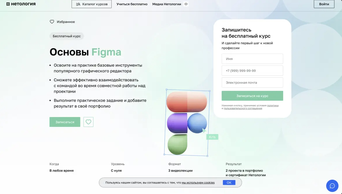 Курс подойдёт для первого знакомства с Figma и не требует предварительной подготовки. В рамках программы учащиеся разбирают базовые инструменты редактора и логику работы с интерфейсами. Рассматриваются формы и текст, сетки и направляющие, маски и стили, а также принципы адаптивного дизайна и работа с цветовыми градиентами.