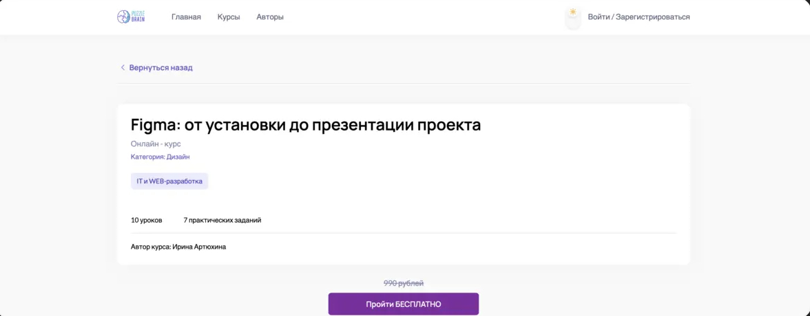 В финале автор курса показывает полноценный пример работы — прототип веб-страницы для сайта с кроссовками. Зрители наблюдают за процессом создания композиции, проработкой визуальных элементов, теней, дублированием блоков, добавлением текстовых слоёв и отзывов. В результате учащиеся видят, как можно сверстать сайт целиком в Figma, не прибегая к написанию кода.