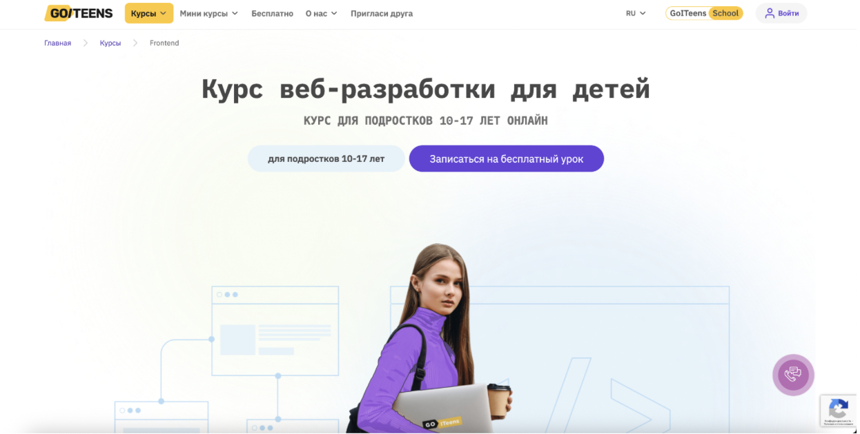 Возраст: подходит детям примерно с 10 лет и старше — курс создан для школьников и подростков, которые хотят научиться делать современные веб-сайты и интерфейсы с нуля.