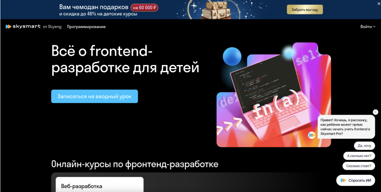 Переходим к первому курсу из рейтинга. Начнём с того варианта, который чаще всего выбирают как «входной билет» в веб-разработку: программа, где школьника аккуратно доводят от первых HTML-страниц до простых интерактивных проектов на JavaScript, с регулярной обратной связью и понятным темпом.