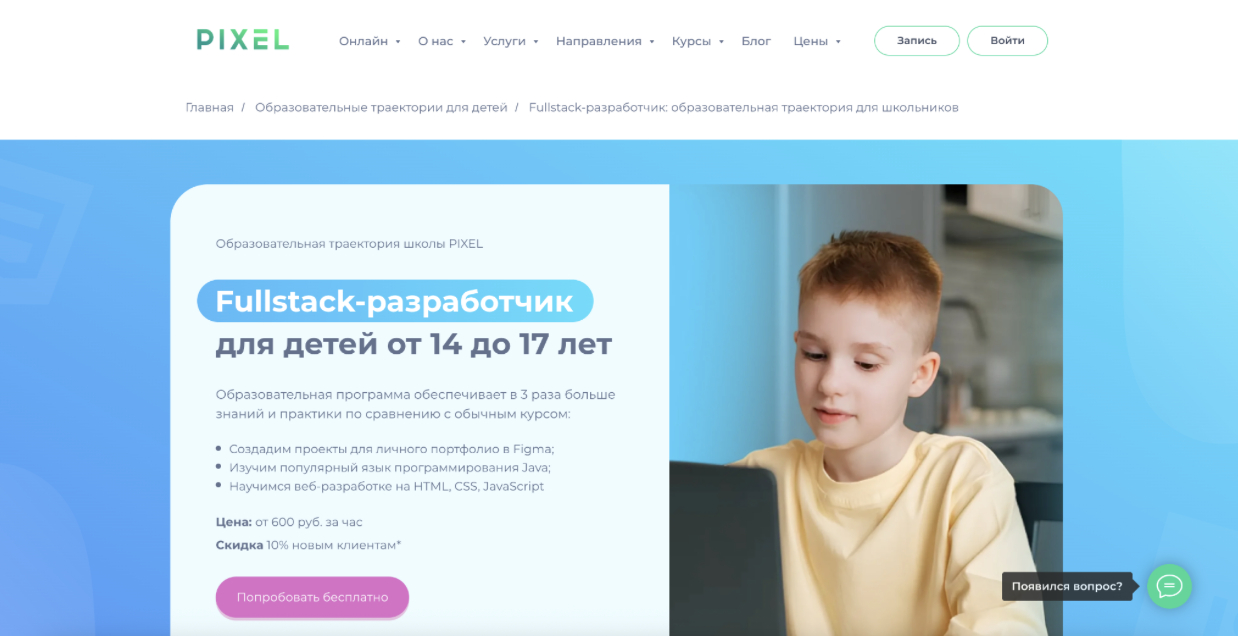 Pixel предлагает не отдельный курс, а полноценную образовательную траекторию по направлению Fullstack-разработки для подростков. Это принципиально иной формат обучения, рассчитанный на системное погружение в IT и создание реального портфолио проектов.