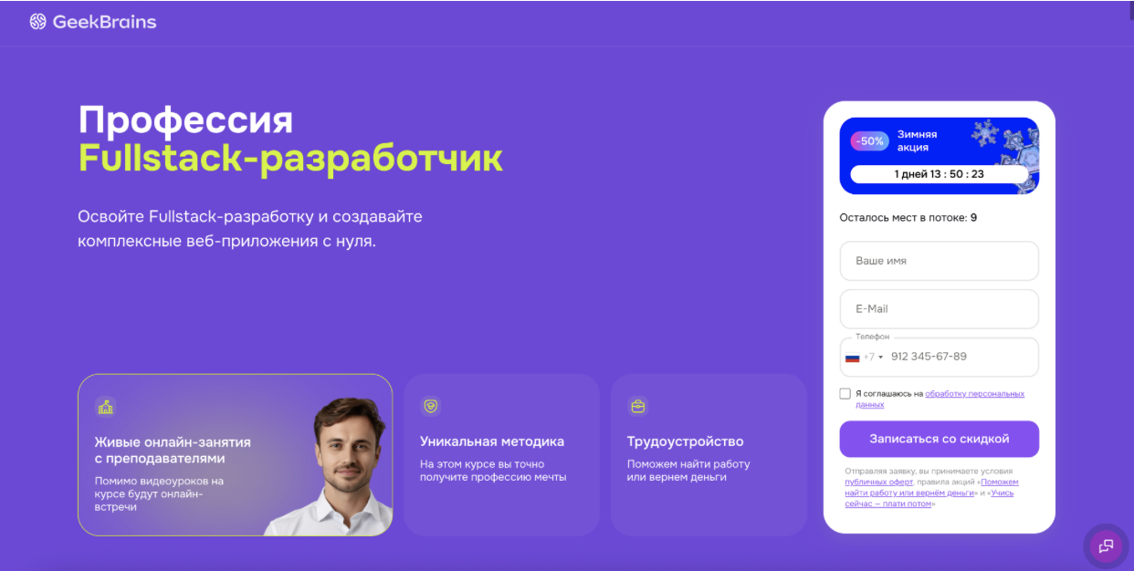 GeekBrains предлагает профессиональный курс Fullstack-разработки, ориентированный на обучение созданию комплексных веб-приложений — от пользовательского интерфейса до серверной логики и баз данных. Программа заявлена как актуальная на 2026 год и включает сопровождение по трудоустройству.