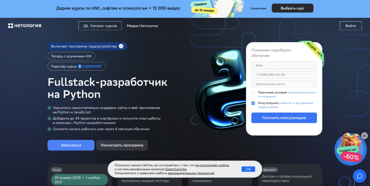 Skillbox предлагает профессиональную программу подготовки Fullstack-разработчиков с упором на Python и современный фронтенд. Курс ориентирован на обучение «под ключ» — от вёрстки и клиентской логики до серверной части и работы с базами данных.