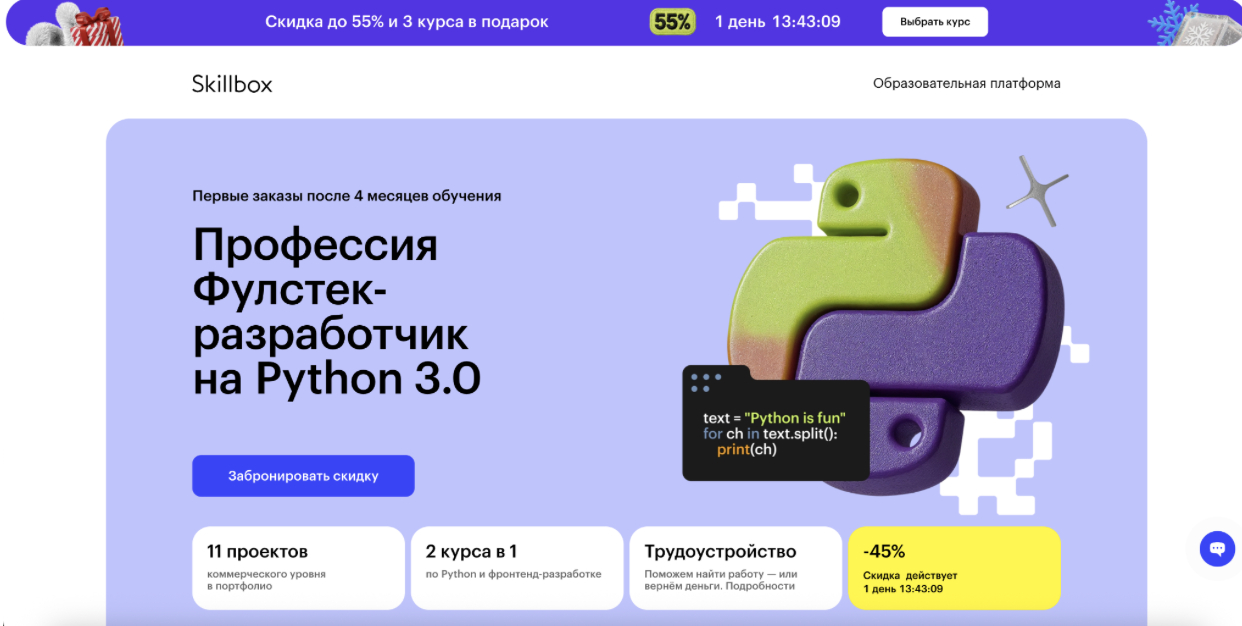 Skillbox предлагает мощную профессиональную программу Fullstack-разработки, хорошо подходящую для взрослых новичков и студентов, ориентированных на рынок труда. В рамках рейтинга курсов для подростков этот вариант уместен прежде всего для старшеклассников 16–17 лет, которые готовы учиться во взрослом режиме и уже рассматривают IT как будущую профессию.