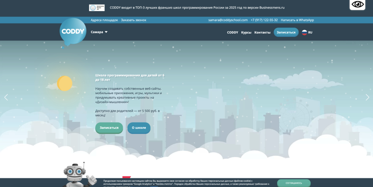 Особенности: Coddy — это не просто школа программирования, а образовательная платформа с широкой линейкой курсов по IT-направлениям: создание игр, веб-сайтов, мобильных приложений, работа с Python, Unity, Roblox и др. Программа построена на проектной практике: дети создают собственные проекты, а не повторяют теорию без применения.