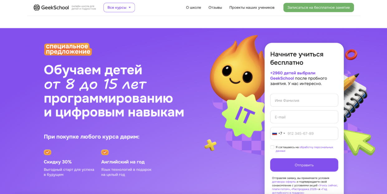 Возраст: GeekSchool предлагает образовательные направления для детей и подростков примерно от 8 до 17 лет, в зависимости от конкретной программы. В рамках школы есть курсы для младших школьников (8–10 лет), подростков среднего возраста (10–14 лет) и старших (до 17 лет). Список и возрастные рамки зависят от конкретного курса, но общий диапазон охватывает почти весь школьный возраст.