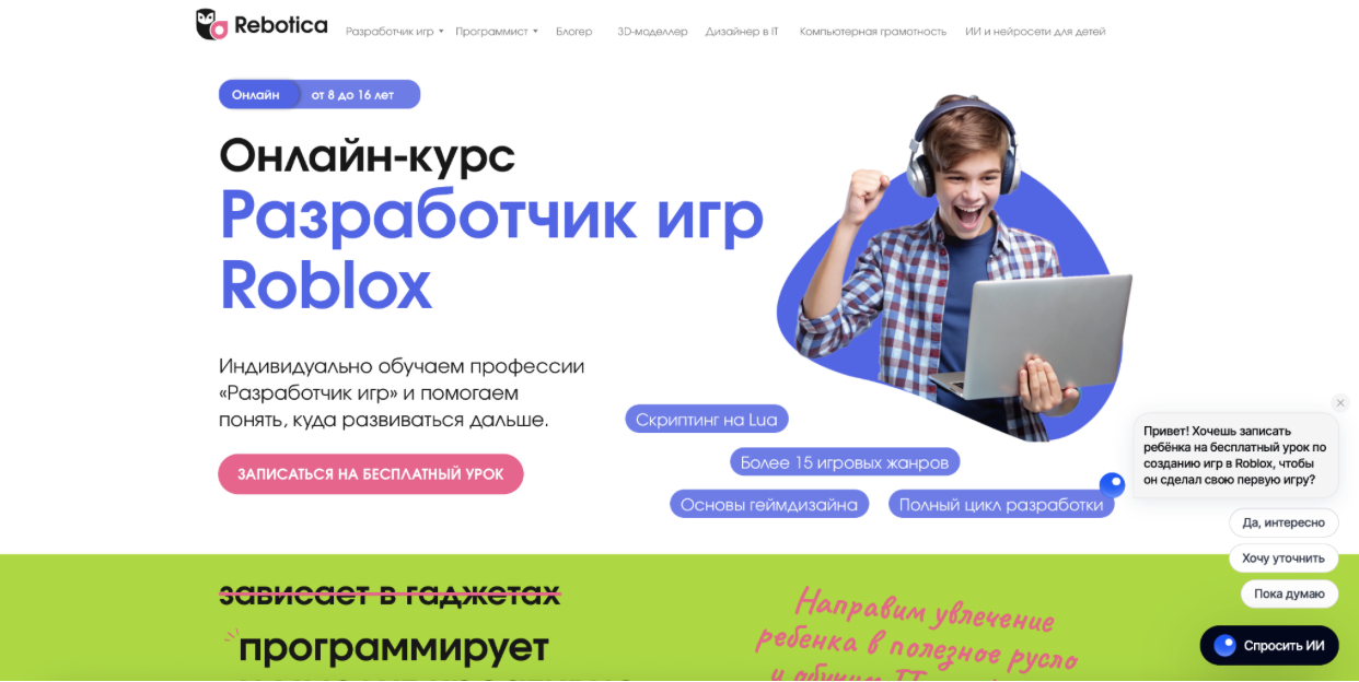 Курсы Coddy включают как классические компьютерные темы (например, программирование игр на Python), так и более специализированные модули — разработка 3D-игр в Unity, создание игр в Roblox Studio на Lua или программирование сайтов на HTML/CSS/JavaScript. Для младших есть визуальные и игровые вводные курсы по алгоритмам.