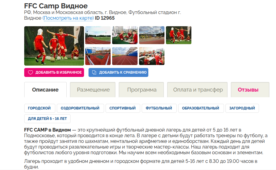 FFC Camp позиционирует себя как крупнейший футбольный дневной лагерь в Подмосковье. Работает с 2020 года, что говорит об определенном опыте и наработанной репутации.