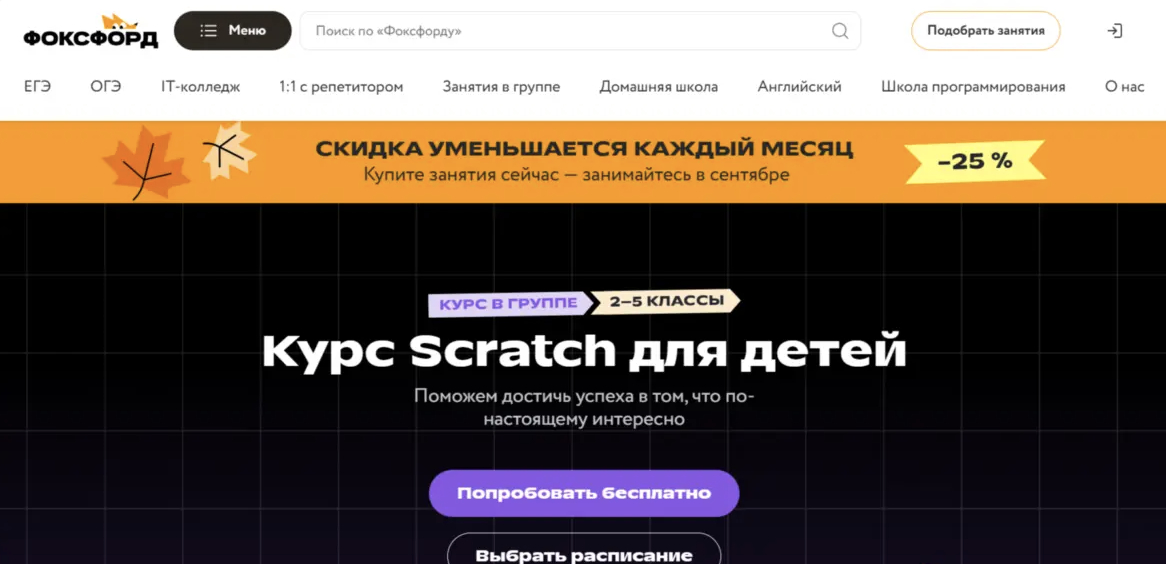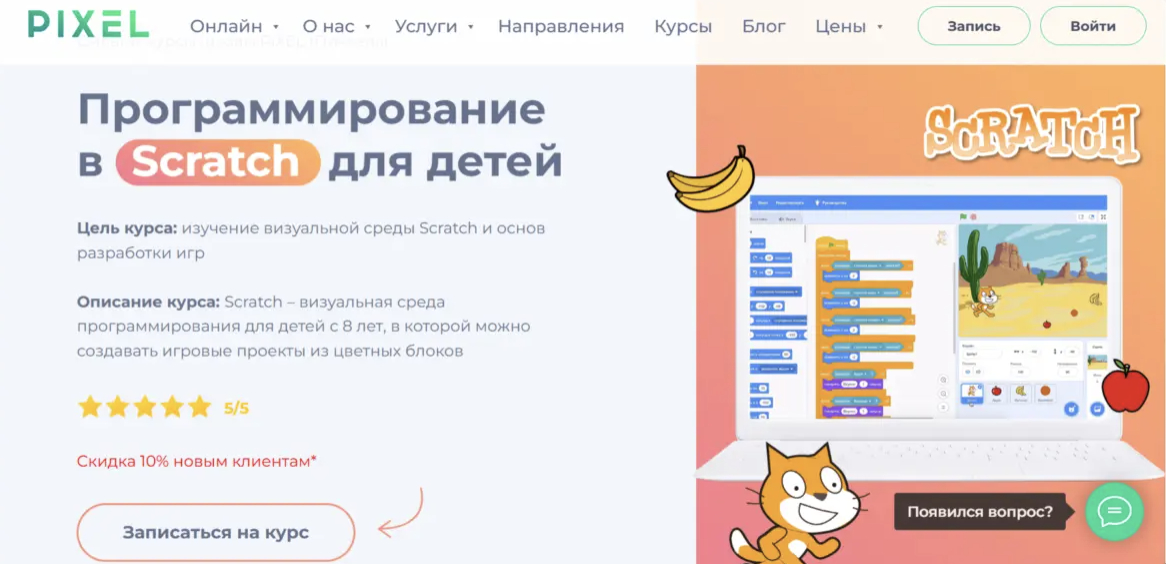 Курс школы программирования «Пиксель» открывает наш рейтинг онлайн-курсов по Scratch для школьников. Программа обучения построена на практическом подходе: уже на первых занятиях ученики начинают создавать собственные проекты — игры, анимации и интерактивные истории. Такой формат позволяет детям быстрее понять логику программирования и увидеть результат своей работы.