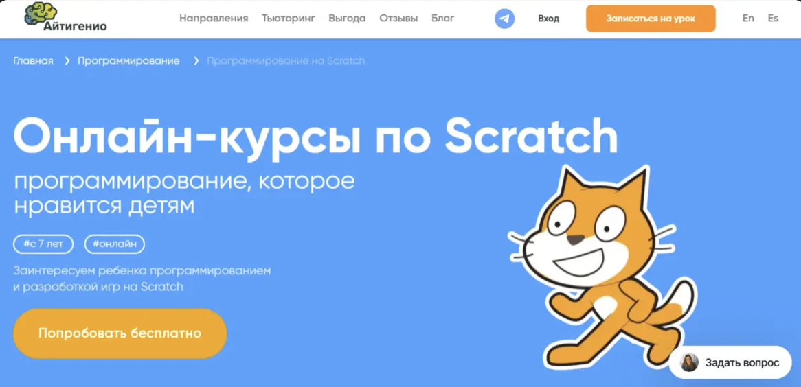 Курс от образовательной платформы Айтигенио предназначен для детей, которые только начинают знакомство с программированием. Обучение проходит в визуальной среде Scratch, что позволяет школьникам освоить базовые принципы алгоритмов в понятной и игровой форме.