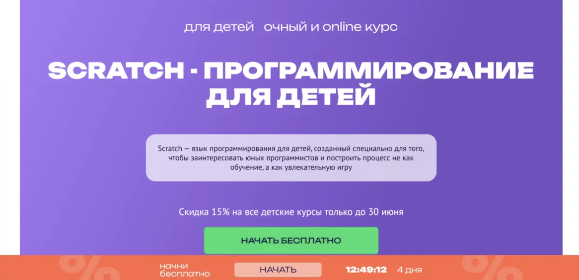 Курс Scratch от Top Academy ориентирован на школьников, которые хотят познакомиться с основами программирования через создание собственных проектов. Обучение проходит в формате живых онлайн-занятий с преподавателем.
