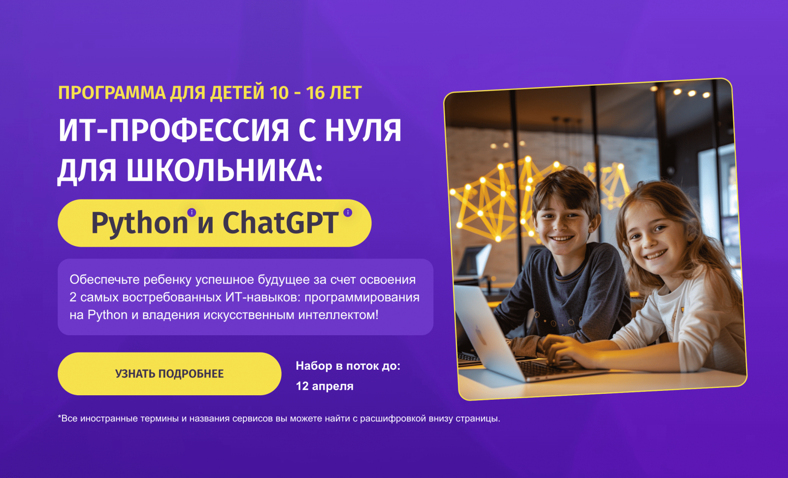 В рамках курса дети изучают базовые принципы работы искусственного интеллекта, учатся применять нейросети для решения учебных задач и создания собственных проектов. Программа подходит для школьников с разным уровнем подготовки и помогает сформировать понимание современных digital-профессий.