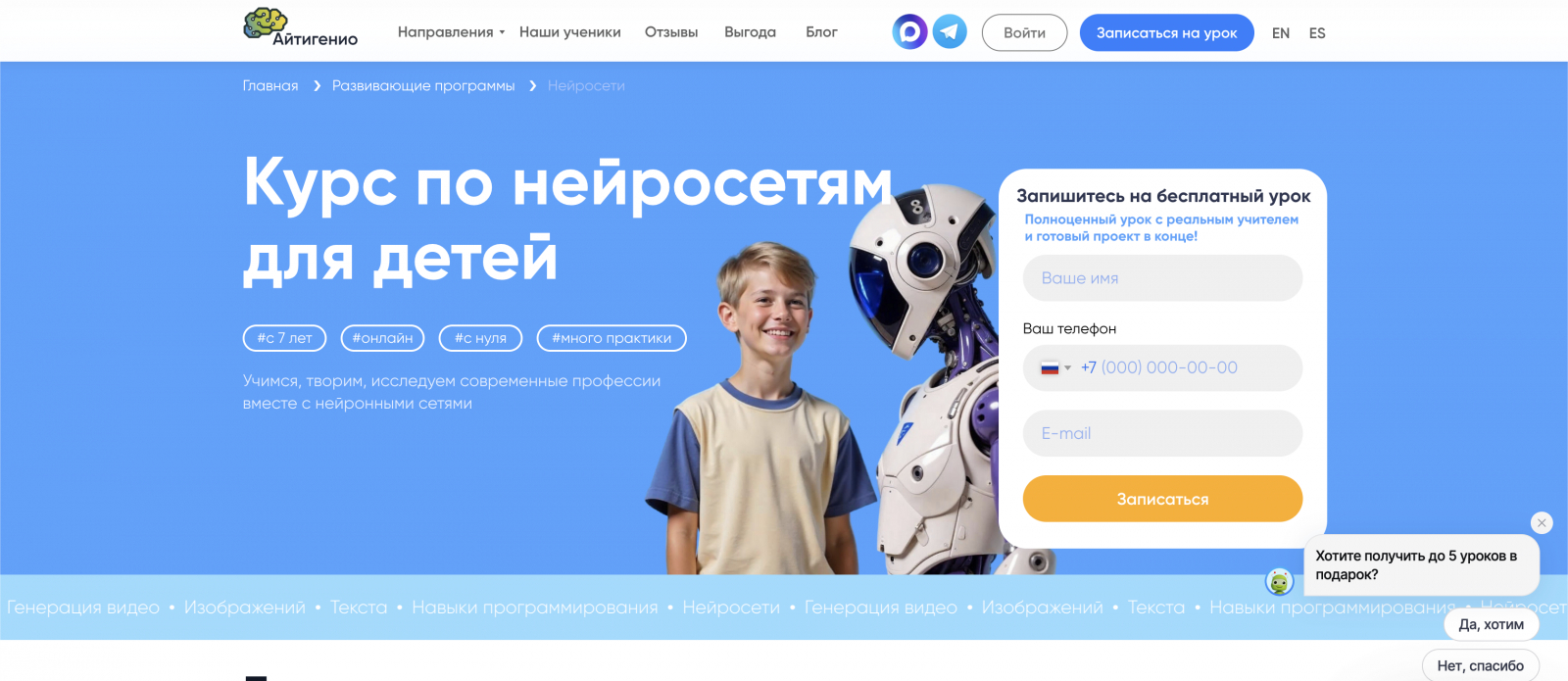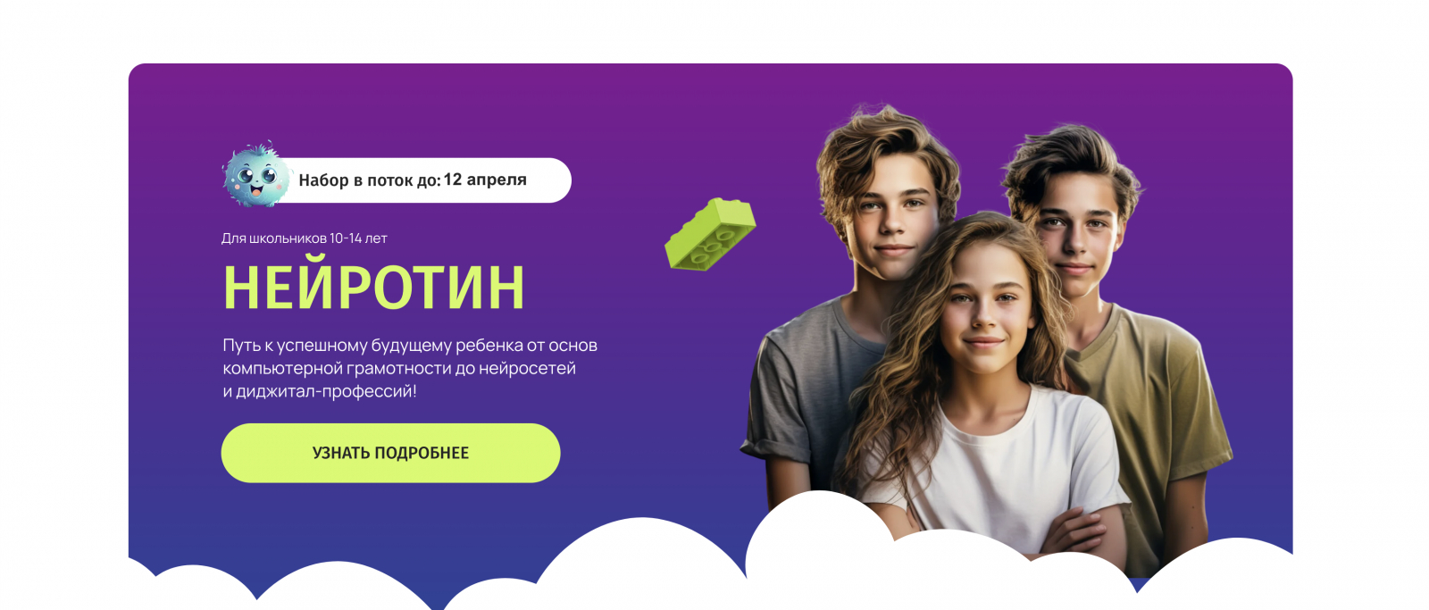 Курс «НейроTeen» от ZeroCoder — это программа по нейросетям для детей 8–14 лет, направленная на освоение базовых компьютерных навыков и знакомство с современными digital-профессиями. В рамках курса школьники изучают основы искусственного интеллекта, пробуют себя в дизайне, веб-разработке и создании игр, а также учатся применять нейросети для учебы и творчества.