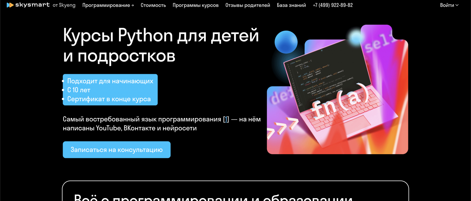 «Python для детей» от Skysmart — интерактивный курс по программированию, на котором дети изучают Python и создают собственные приложения, включая сервисы для работы с данными.