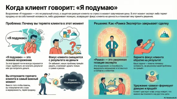 «Подумаю» — это не отказ. Это выход из дискомфортного контакта. Клиент просто забыл, ЗА ЧТО он платит, и хочет сбежать от напряжения.