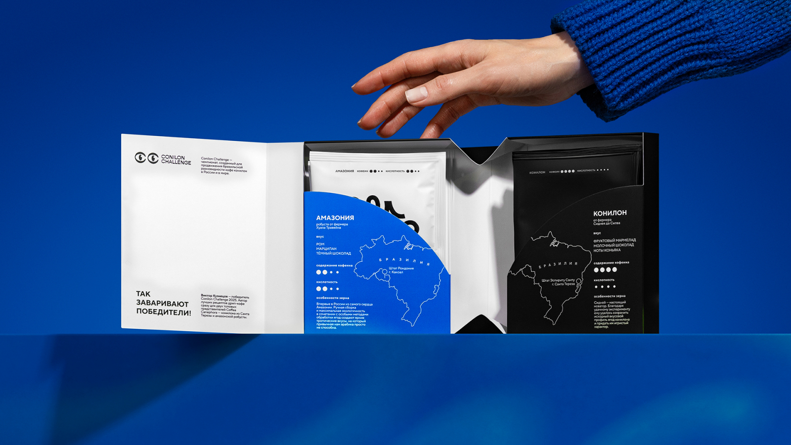 Упаковка содержала много важной информации, нужно было рассказать и о самом чемпионате, и о разнице вкусов, вошедших в новый сет дрипов, сортов, их происхождении, но сделать это компактно и оригинально. Решение было найдено — визуально упаковка превратилась в некий «трактат». На обложке поместили маскота Котилона в переплетающихся ветвях кофейного дерева в стилистике дизайна года Амазонии. На развороте расположили общую информация о Conilon Challenge и победителе этого года. Внутри, с двух сторон, разместили подробное описание каждого лота. Синяя часть упаковки с конвертом для робусты из штата Родония была вдохновлена глубиной и изгибами реки Амазонки. Черная часть, посвященная конилону из Эспириту Санту, сохранила связь с прошлогодним дизайном и Котилоном. На обратной стороне разместился рецепт от победителя по завариванию с видеоинструкцией.