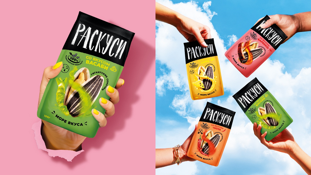 Агентство DS1 branding решало амбициозную задачу: омолодить категорию семечек и втащить её в рацион поколения Z. Агрохолдинг «Степь» запустил бренд «Раскуси», сделав ставку на дерзкий дизайн и экстремальные вкусы — васаби, чили, барбекю. Визуально работа выглядит безупречно: яркие фуд-зоны, стильный чёрный фон, шрифты, напоминающие крафтовую графику.