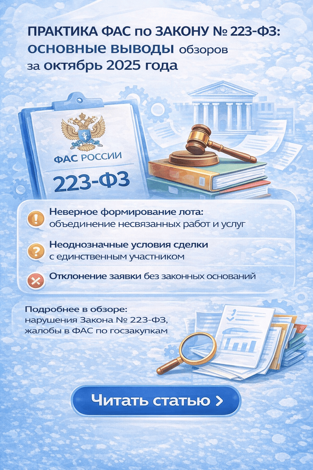 Обзоры ФАС по Закону № 223-ФЗ за октябрь 2025 года показывают, что ключевые риски для заказчиков связаны с: