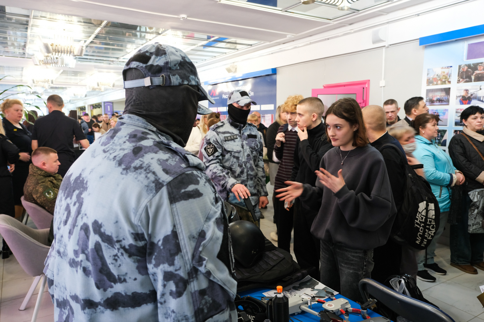 В мероприятии приняли участие сотрудники ОМОН «Таир» Росгвардии. Для посетителей ярмарки росгвардейцы развернули выставку современной экипировки, специального снаряжения и образцов беспилотных летательных аппаратов (БПЛА), стоящих на вооружении спецподразделений Росгвардии. Стражи правопорядка подробно рассказали о специфике службы, задачах, решаемых различными подразделениями силового ведомства, а также проинформировали соискателей об открытых вакансиях в различных подразделениях и разъяснили ключевые требования к кандидатам. Особый акцент был сделан на льготах и социальных гарантиях, предоставляемых представителям войск правопорядка и членам их семей.