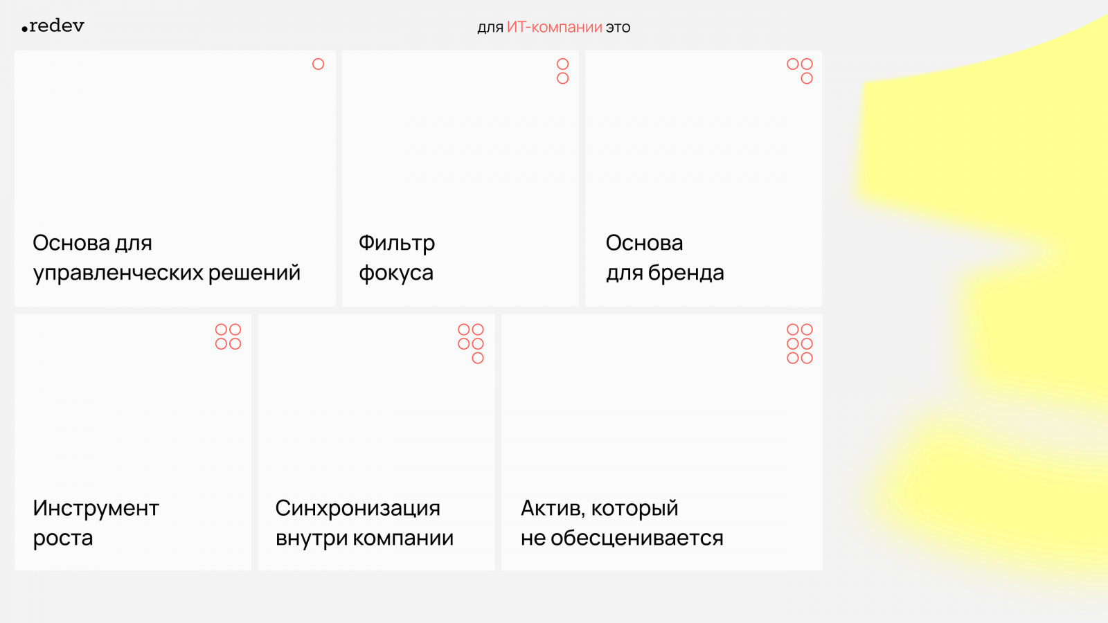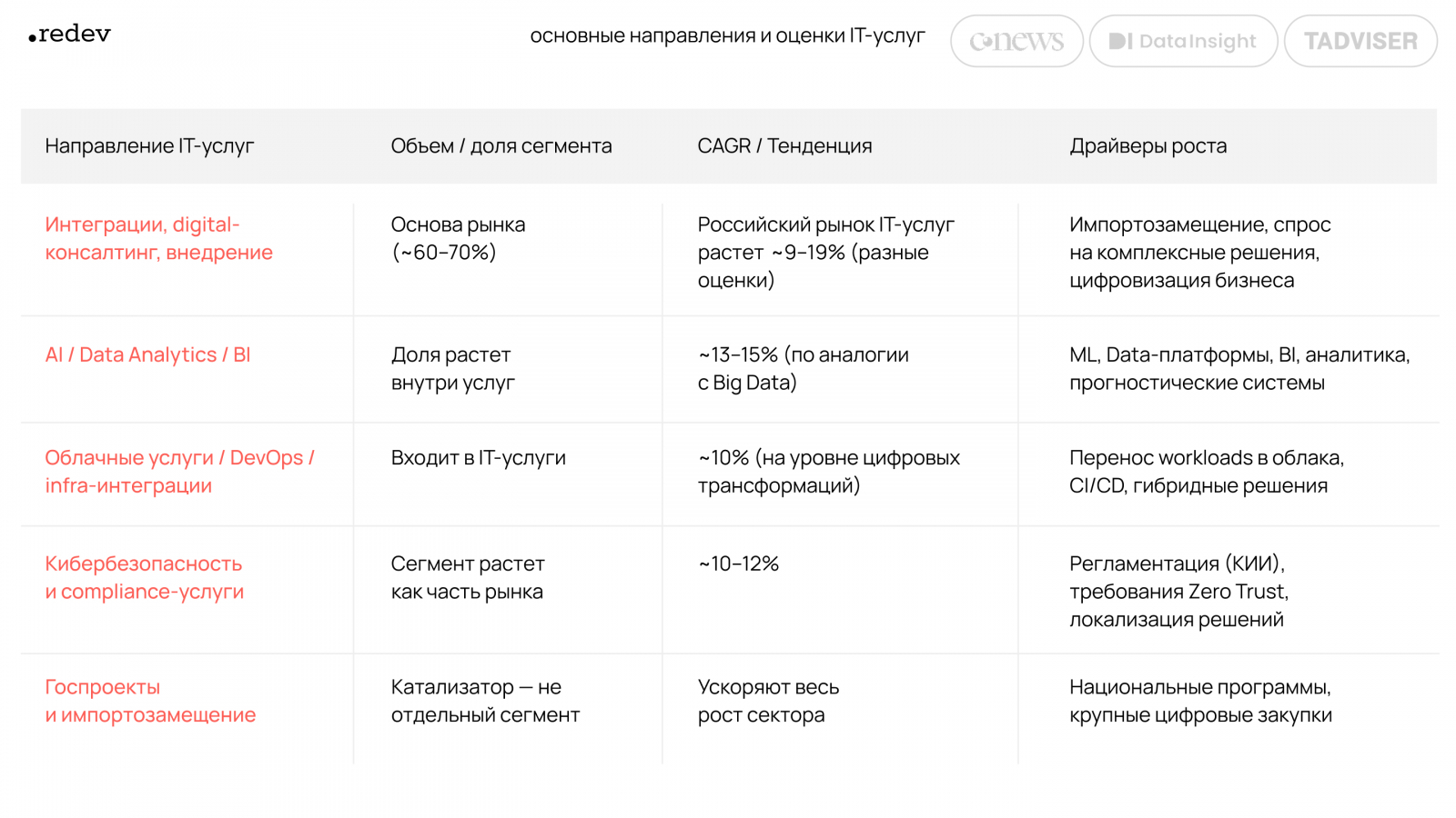 Опыт .redev показал, что на втором этапе следует оценить отрасли, тренды и направления, где компания могла бы развиваться наиболее эффективно. Ключевыми критериями служат: порог входа, уровень конкуренции, емкость рынка и потенциал роста. Это позволяет сосредоточиться на сегментах, где ИТ-партнер может предложить максимальную ценность и получить устойчивый спрос.