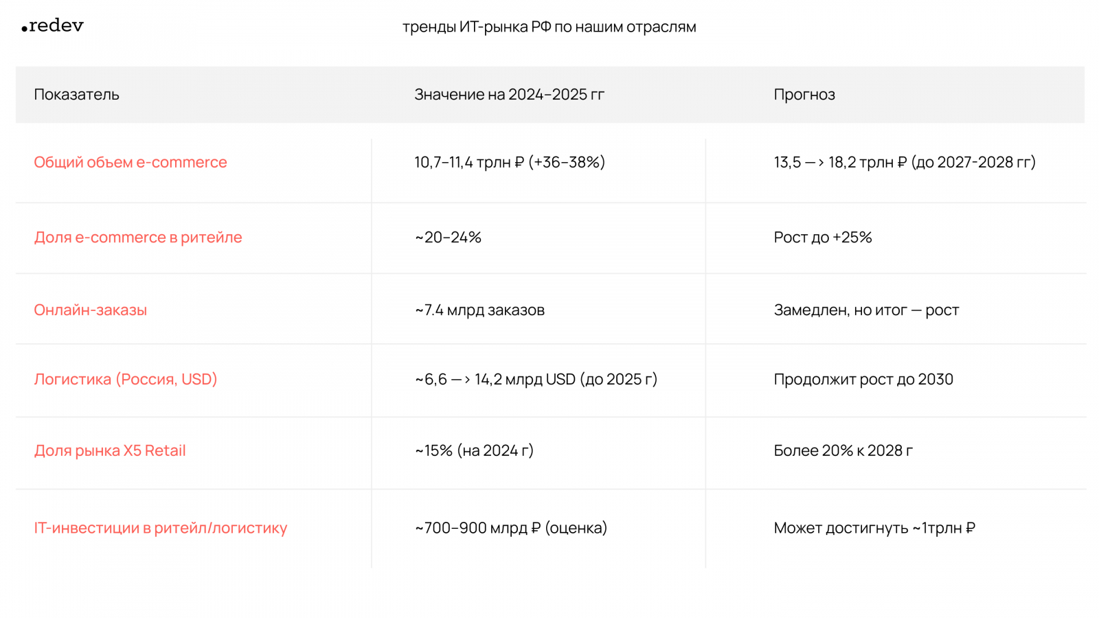 К примеру, по данным Data Insight, общий объем рынка e-commerce в 2024-2025 годах оценивался в 10,7 - 11,4 трлн рублей. К 2028-му году рынок e-com может вырасти, согласно прогнозам Сбера и MPSTATS, до 27 трлн рублей. При этом ИТ-инвестиции в этот сектор уже оцениваются в 700-900 млрд рублей, а к концу 2030-х перешагнут за 1 трлн рублей. Эти показатели делают направление перспективным для наращивания внутри него ИТ-специализации.