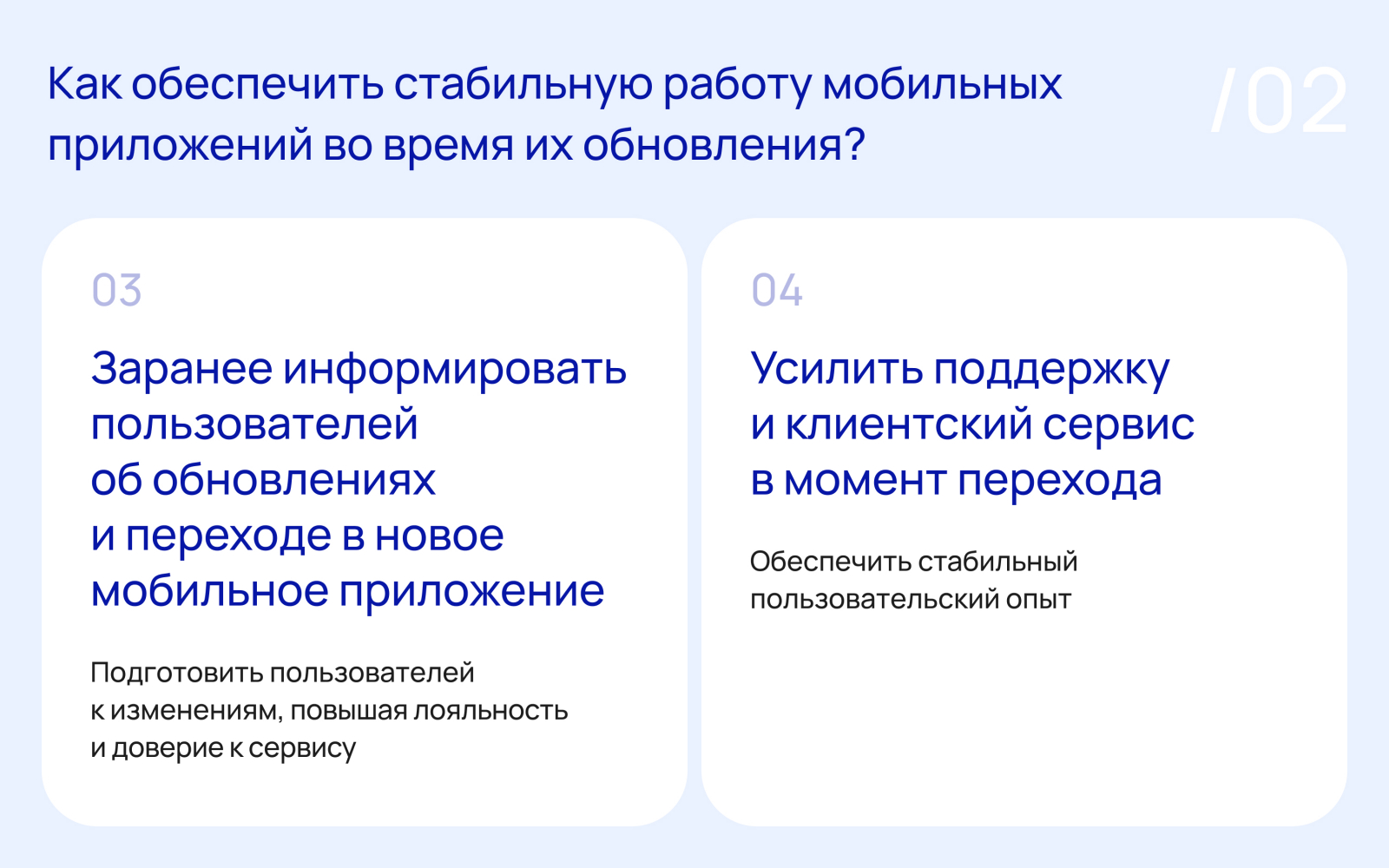 При обновлении приложений техподдержка была также активно задействована. Для пользователей, которые обновлялись не сразу, была обеспечена обратная совместимость и поддерживались оба поколения мобильных приложений. Старые версии продолжали корректно работать, а сервера постепенно переводили трафик на новую логику. При достижении целевой массы пользователей на новых приложениях было включено обязательное обновление без неожиданностей для пользователей и с полной управляемостью для бизнеса.