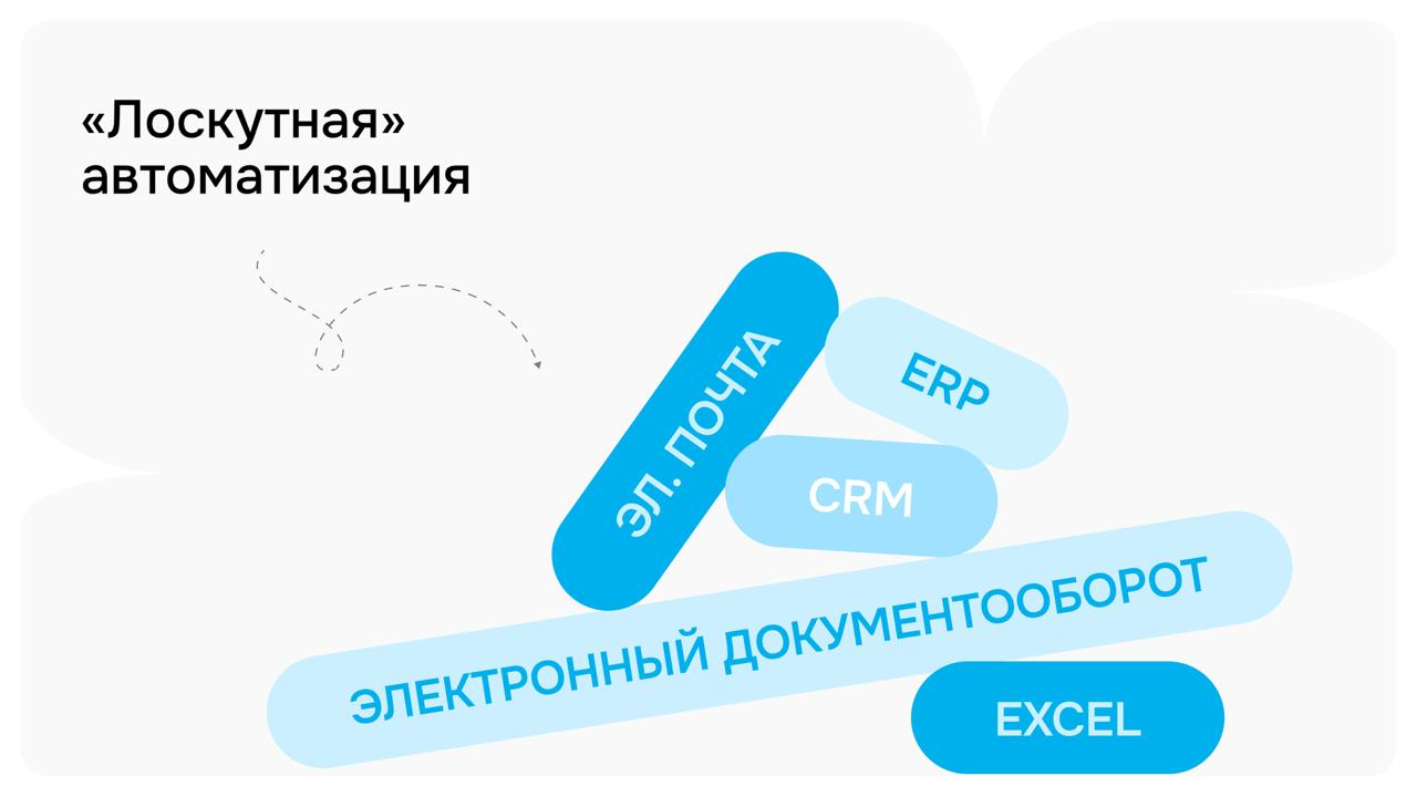 Бизнес видит в автоматизации решение своих задач. Сайт для представления продукции и услуг, CRM для управления клиентами и ведения программ лояльности, личный кабинет — для ускорения операционной работы сотрудников. Однако если эти системы не связаны между собой, вместо решения своих задач компания получает «лоскутную» автоматизацию. То есть разрозненный и местами несовместимый набор сервисов от разных вендоров, нехватку интеграций и необходимость дорогих ручных доработок.