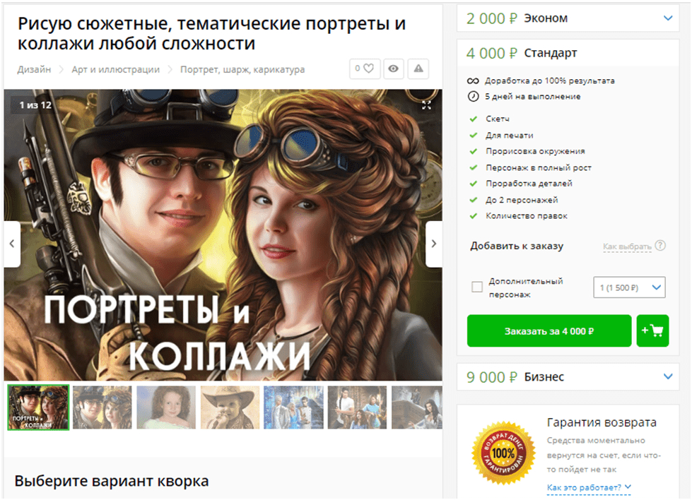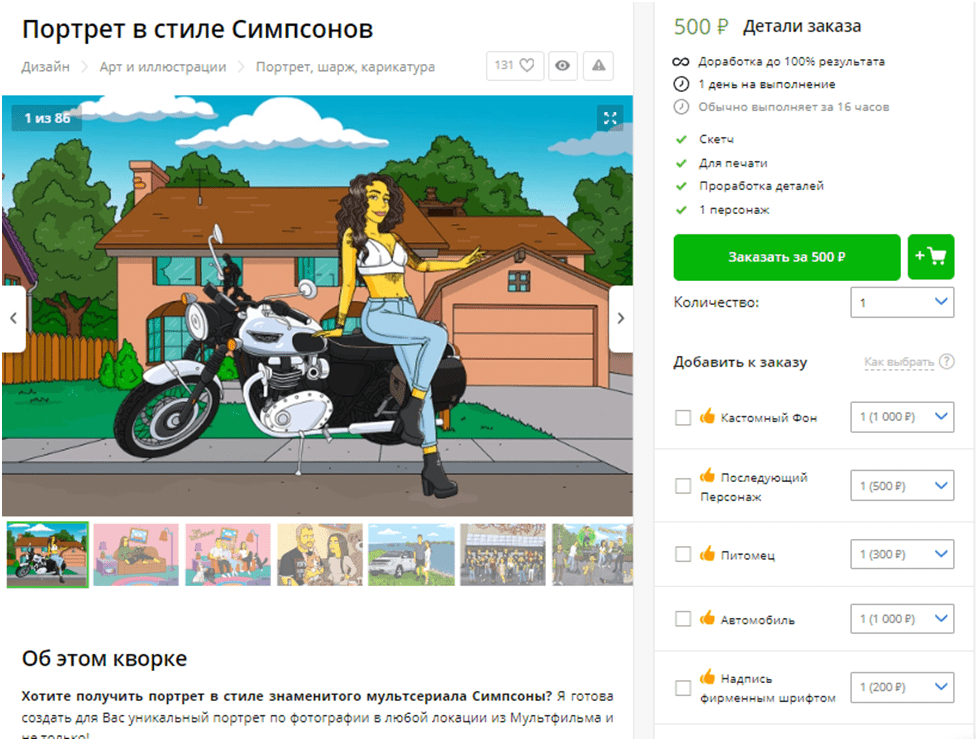 Сколько можно заработать на этом? Все зависит от правильности выбора ниши и вашего подхода. Вот например девушка занимается портретами в стиле Симпсонов. Минимальная стоимость заказа 500 рублей. По факту больше, так как за выбор дополнительных опций нужно доплачивать. Давайте посчитаем, что средний заказ стоит 1000 рублей.