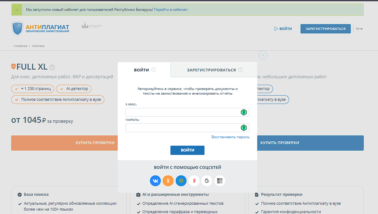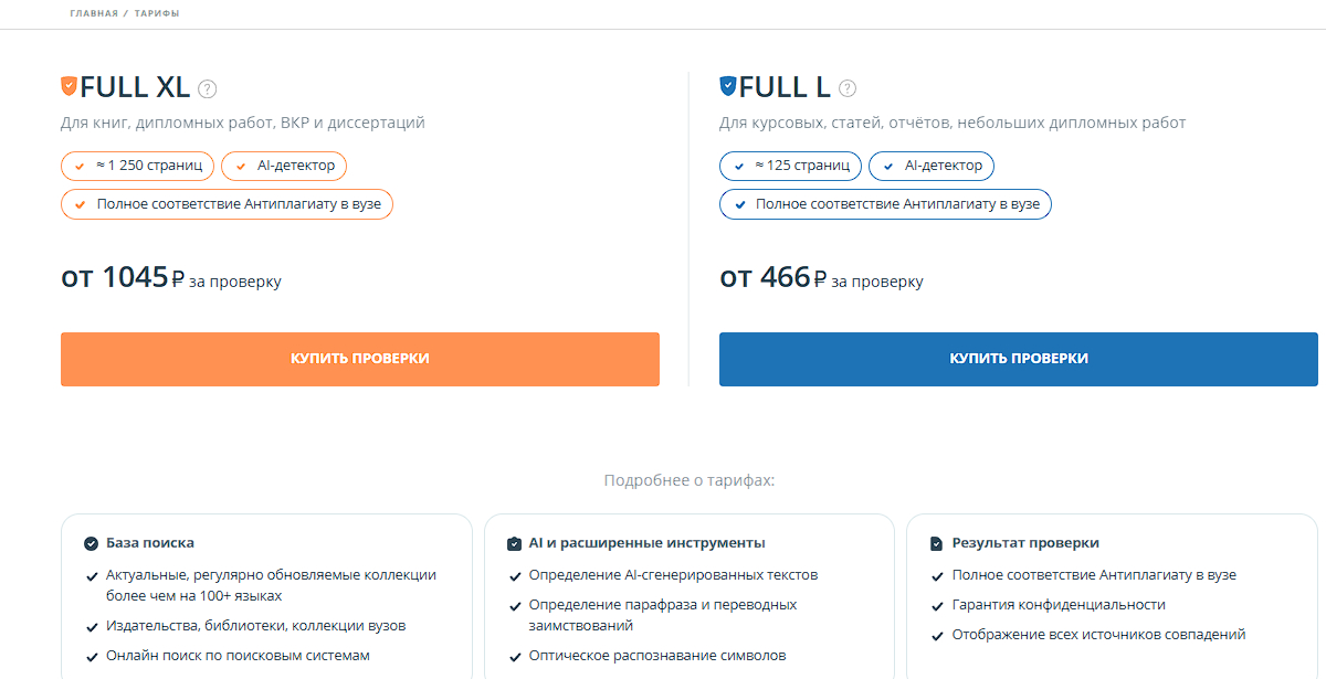 Тариф Full — самый полный, он включает все доступные модули поиска, проверку на ИИ и возможность скачать полный отчет с антиплагиат ру. Цена на тарифы антиплагиат ру может меняться, актуальную информацию всегда проверяй на официальном сайте. Можно купить проверку поштучно или оформить аккаунт антиплагиат ру с полным доступом. Для студентов, работающих над дипломом, часто хватает стандартного пакета на месяц.