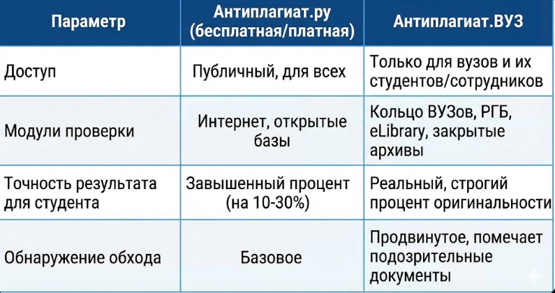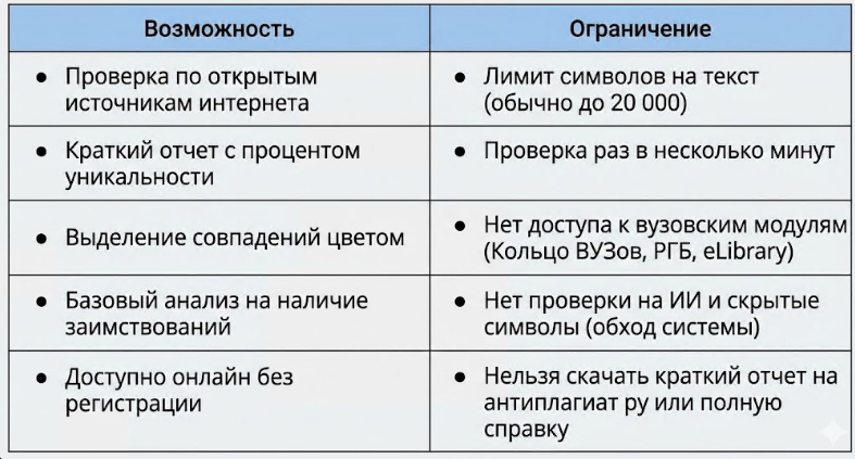 Ключевое отличие: эти сервисы не имеют доступа к закрытым вузовским базам и «Кольцу ВУЗов», поэтому для проверки академических работ они не подходят.