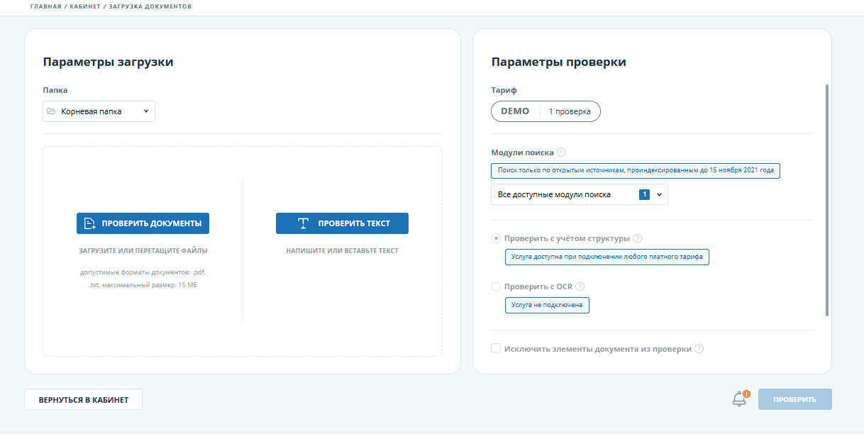 Чтобы проверить документ, зайди в личный кабинет антиплагиат ру и нажми «Проверить текст». Система предложит загрузить документ в антиплагиат ру (DOC, PDF, TXT, до 5 Мб) или вставить текст в поле. Если у тебя платный тариф, можно выбрать дополнительные модули проверки.