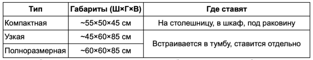 Если у вас совсем мало места, то подойдет компактная модель — настольная или с установкой в шкаф. Вмещает до 6 комплектов посуды, не требует подключения к горячей воде и расходует минимум ресурсов. Подходит для дачи, студии или съемной квартиры.