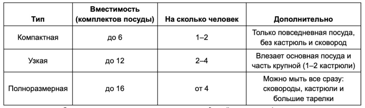 Если семья большая или часто приходят гости, то лучше взять полноразмерную модель. Она вмещает до 16 комплектов посуды, поддерживает больше программ, тише работает и удобнее по организации внутреннего пространства. Она выгоднее по ресурсоемкости на одну мойку и ее не придется запускать по три раза в день.