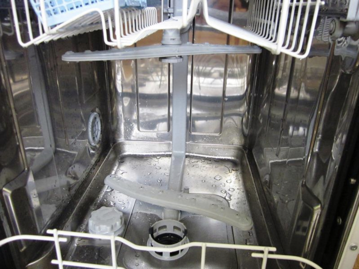 Почти во всех современных посудомойках, кроме компактных, установлены 3 разбрызгивателя: нижний, средний, верхний. Нижний расположен на дне камеры: он самый крупный и подает воду с наибольшим напором. Средний установлен под верхней корзиной и помогает промывать тарелки и чашки. Верхний — на потолке. Нужен, чтобы до конца промывать посуду, уложенную в верхней корзине.