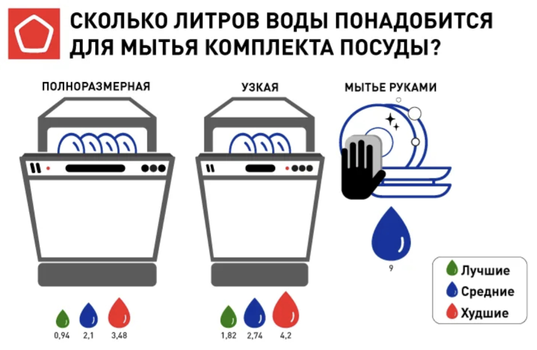 Сравнение расхода воды между разными посудомойками и ручным мытьем
