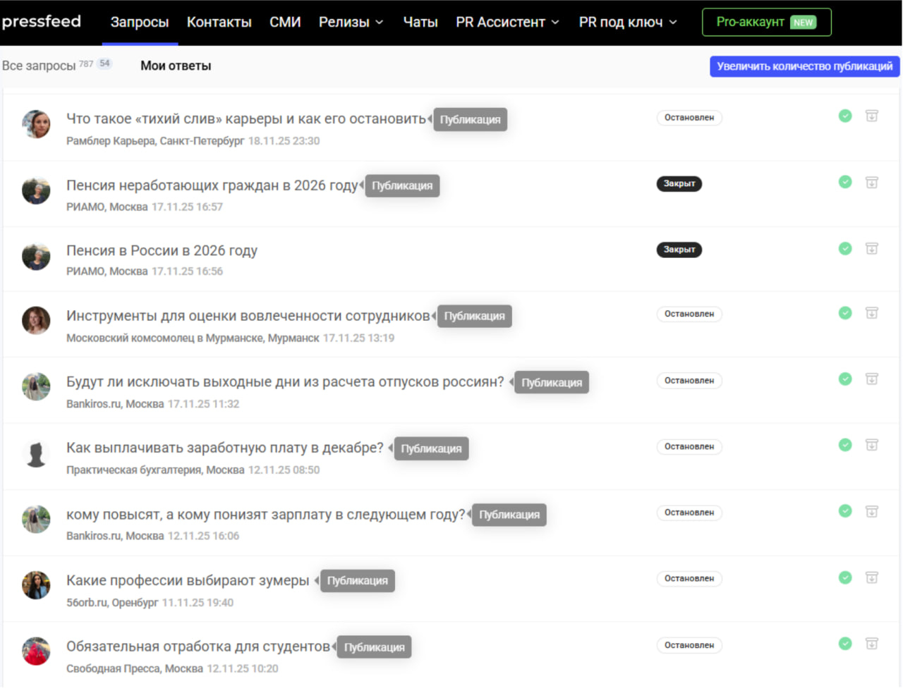 Порадовало, что в интерфейсе сервиса журналисты сами пишут запросы, проставляют статус ответа и прикрепляют публикацию — всё прозрачно и структурировано.