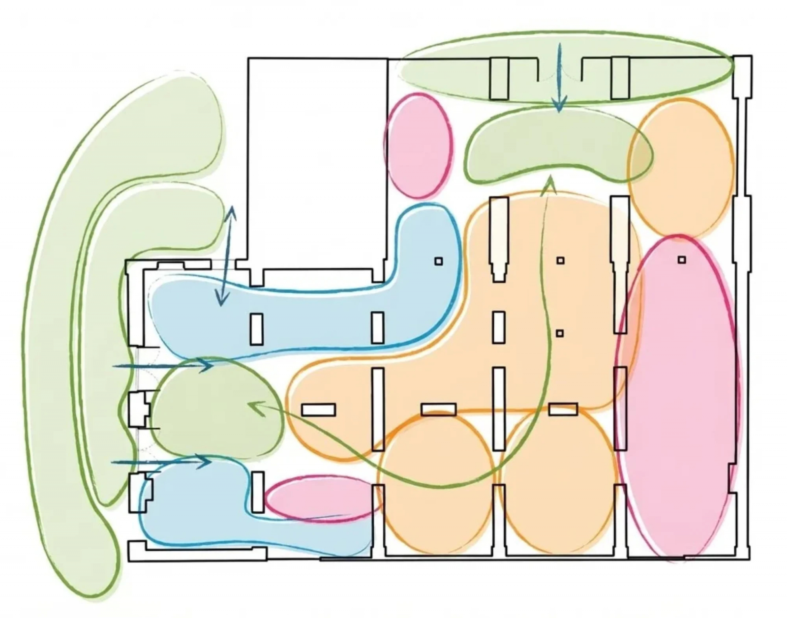 Когда мы начинаем работать с планировкой магазина, мы не расставляем сразу торговое оборудование. Мы рисуем карту эмоциональных зон — так называемые "баблы".
