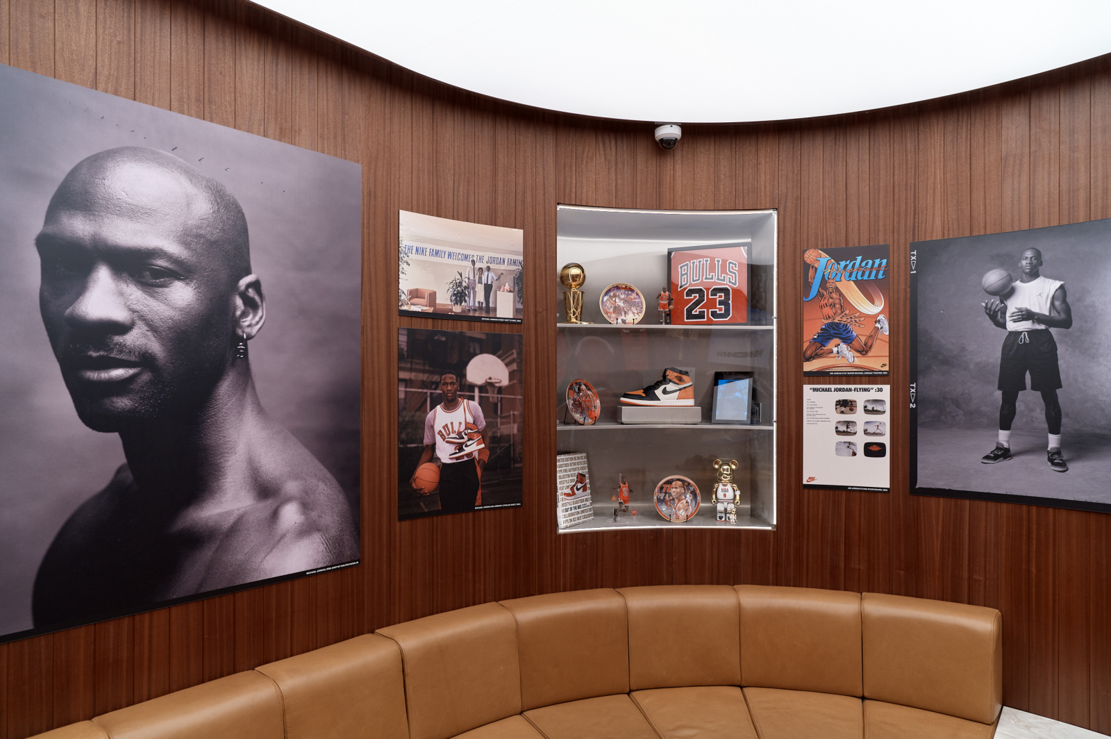 Здесь идёт работа на контрасте. В торговом зале дизайн держит покупателя в тонусе, а в лаунже — расслабляет, покупатель погружается в историю Майкла Джордана. Так интерьер магазина помогает переключать состояние человека в нужный нам момент.