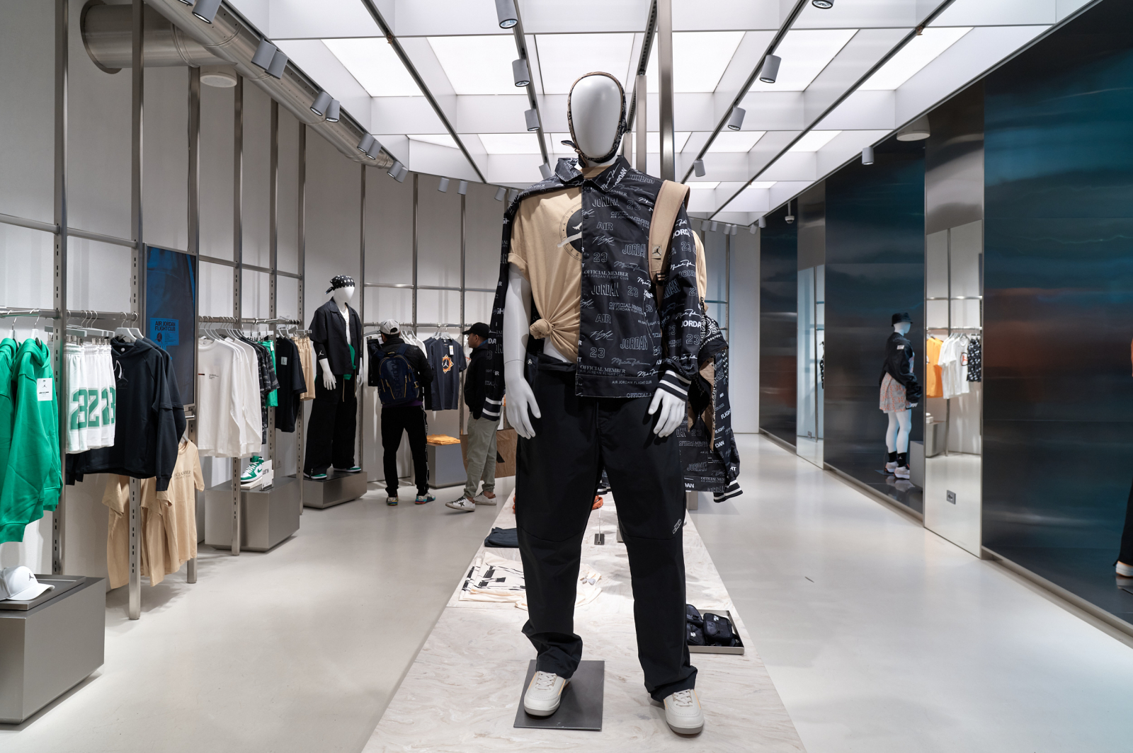 Торговый зал и примерочные зонированы не только стенами, но и атмосферой. Торговая зона оформлена в холодной эстетике. В отделке использованы нержавеющая сталь, бетон. В дизайне строгая геометрия. Пространство напоминает лабораторию, подчёркивается технологичность бренда. Примерочные и лаунж оформлены в тёплой эстетике. Деревянные панели, кожаные диваны, уютный свет и плавные формы.