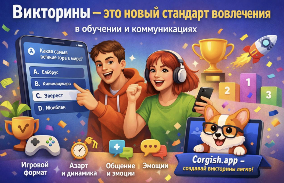 Именно такие задачи решает Corgish.app — это онлайн-платформа для создания интерактивных викторин, которая позволяет создавать викторины для бизнеса, образования и развлечений без лишних сложностей. На платформе есть готовая библиотека тестов, интуитивно понятный редактор викторин, ИИ-помощник для генерации вопросов и даже мини-приложение для VK и Telegram-бот для быстрой интеграции в любимые мессенджеры.