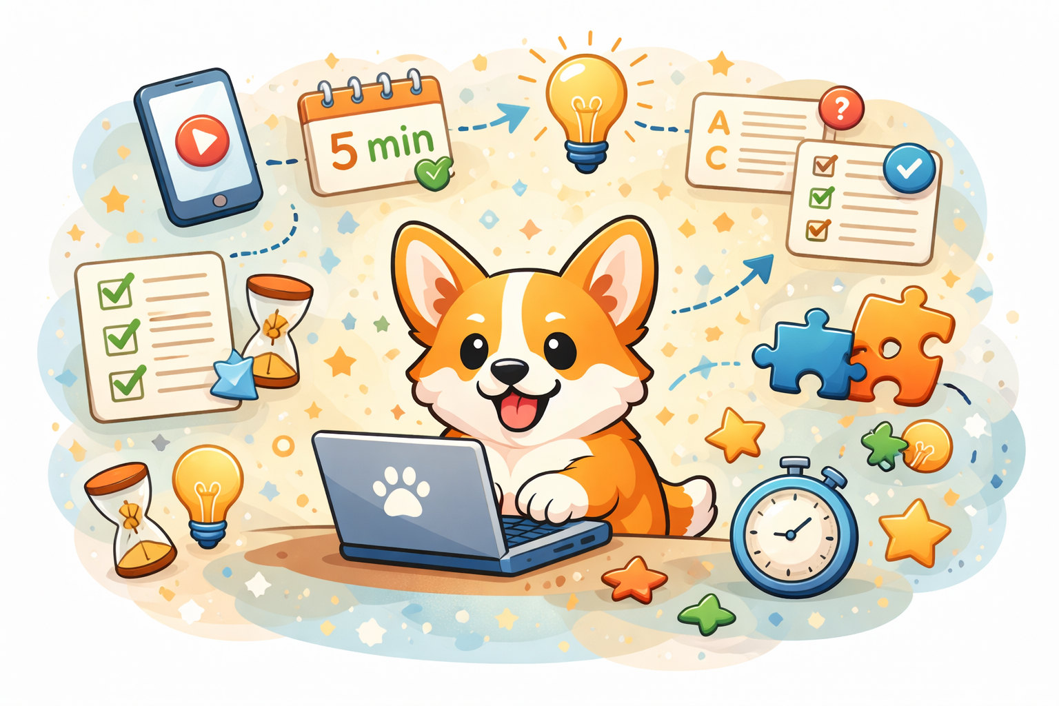 Показательный пример такого подхода — платформа Corgish, где квизы используются как самостоятельные микро-единицы обучения.