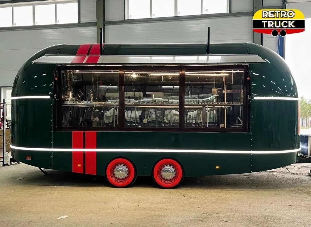 Глянцевый черный кузов с золотыми вставками. Такой фудтрак словно со съемочной площадки 50-х годов и Одри Хепборн только что отошла от него с круассаном и чашечкой кофе к витрине Тиффани. Для концепций с премиальным позиционированием.