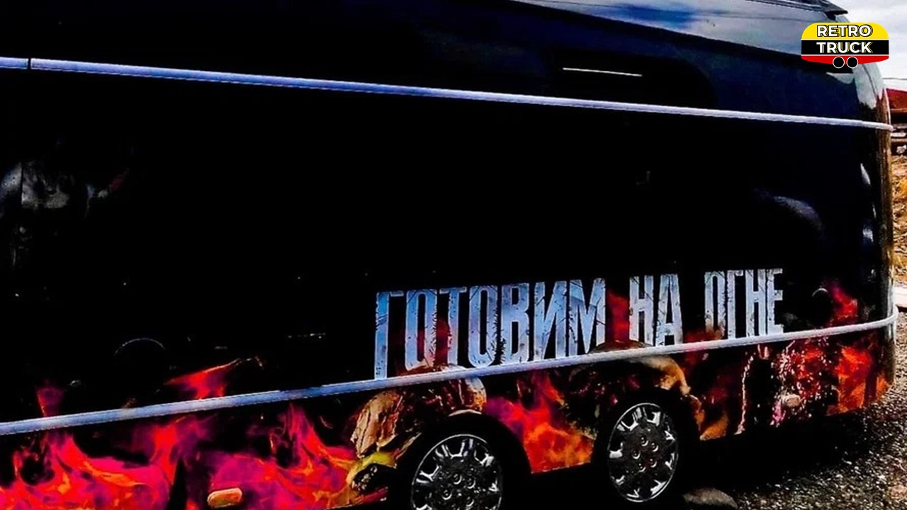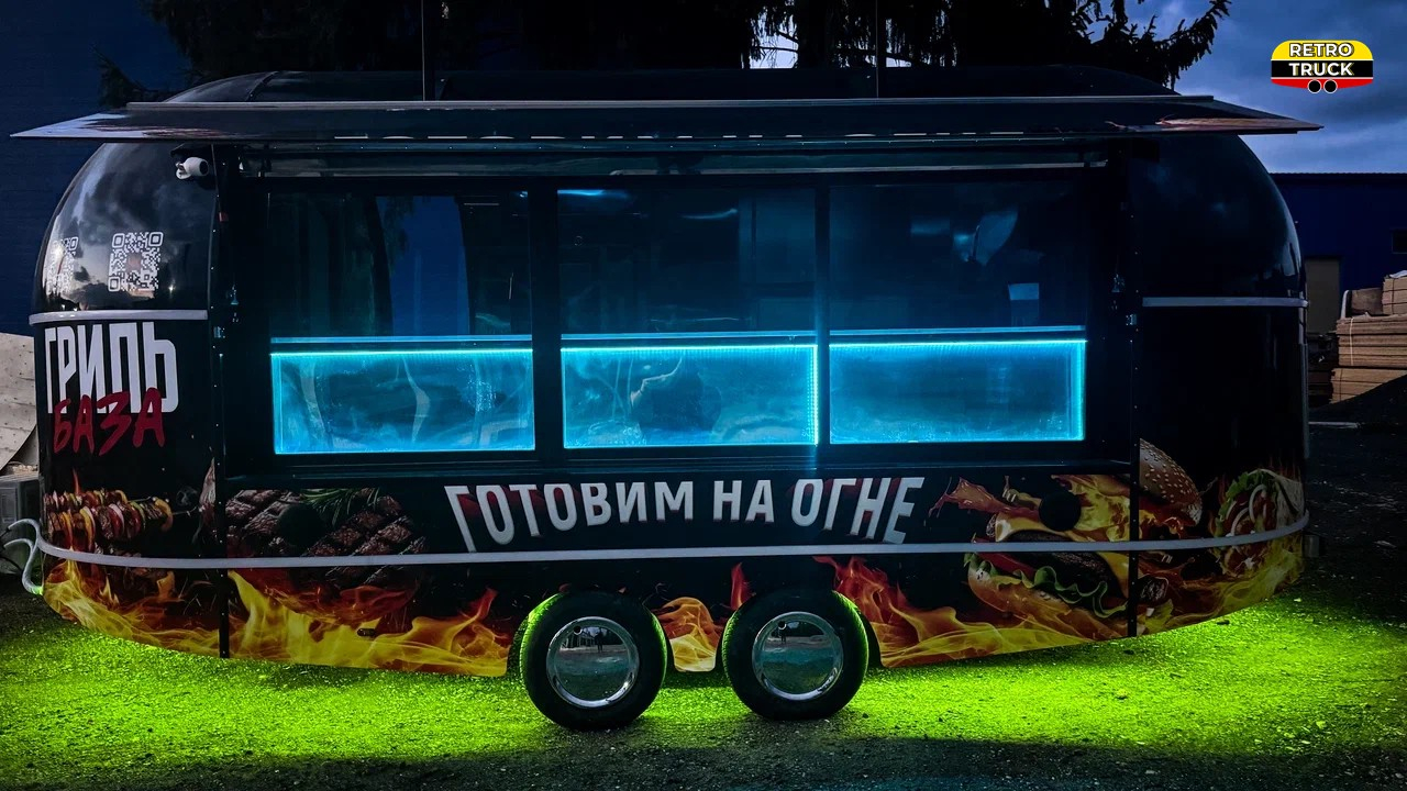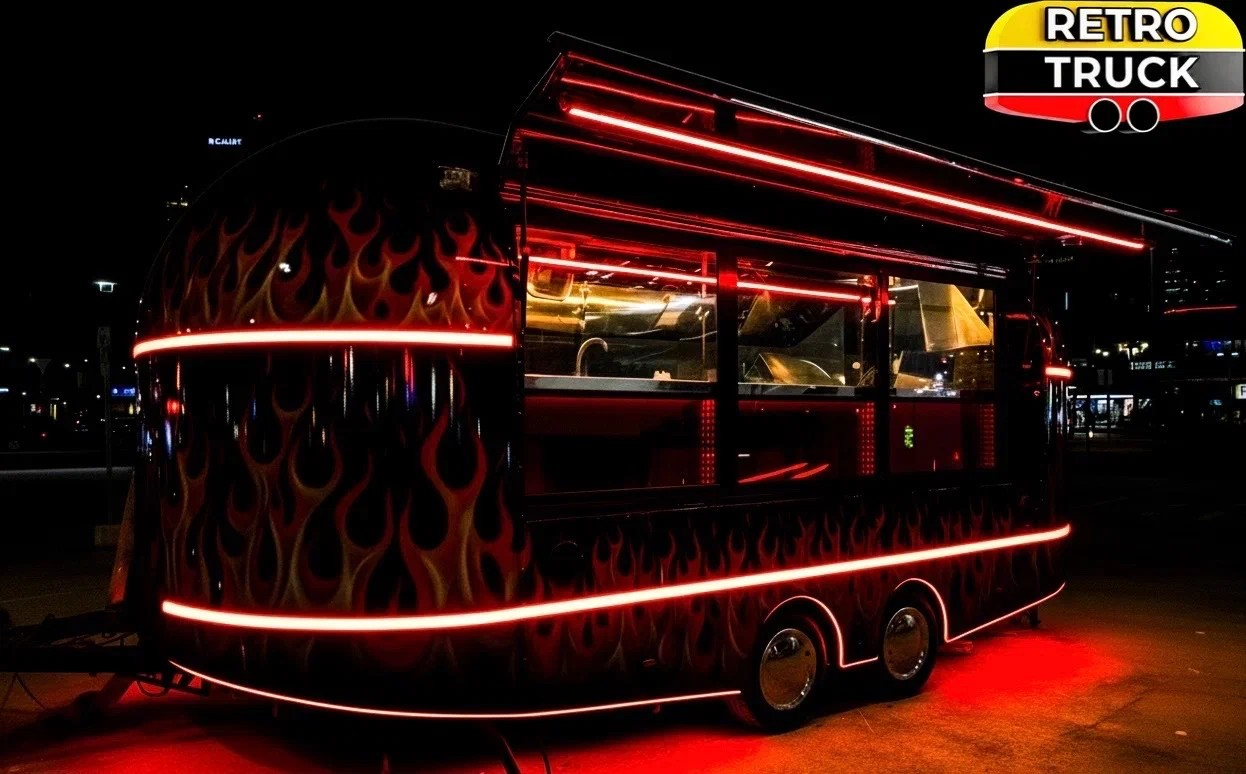 В основе- черный или темно-бордовый или оранжевый глянцевый кузов. По низу и вдоль бортов ползут языки пламени, выполненные в оранжевых, красных и желтых тонах. Создается полная иллюзия, что трейлер объят огнем. В темное время суток огонь оживает с помощью цветной светодиодной подсветки. Название бренда часто выполняется в стиле «раскаленного металла». Идеальное решение для бургерных на углях, шашлычных, пиццерий с дровяной печью или гриль-баров. Визуал напрямую говорит о способе приготовления и вызывает мощные ассоциации с жаром, углями и аутентичным вкусом.