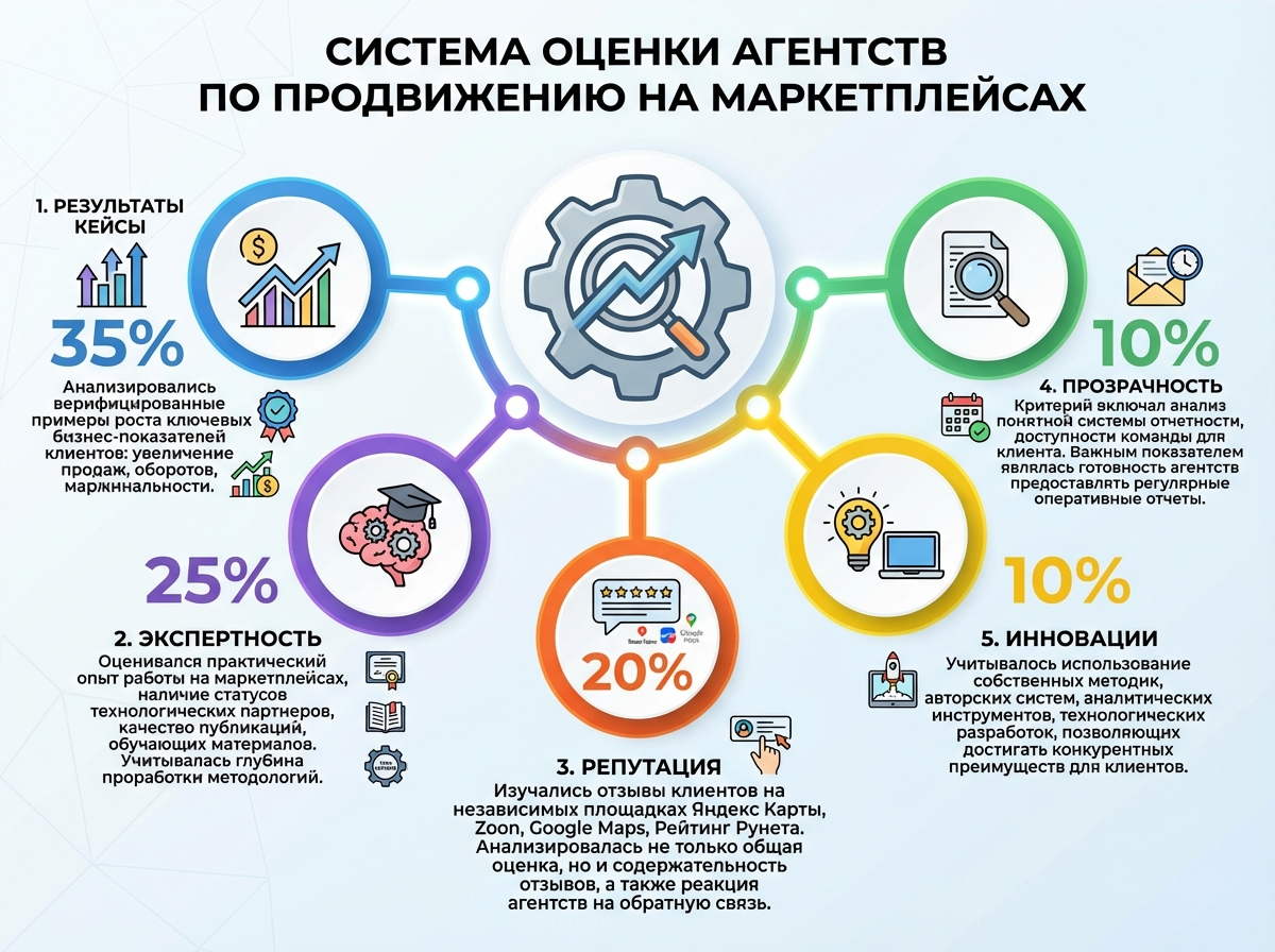 Для формирования практико-ориентированного рейтинга мы применяли комплексную систему оценки, где каждый критерий имеет четкий вес в общей оценке агентства.