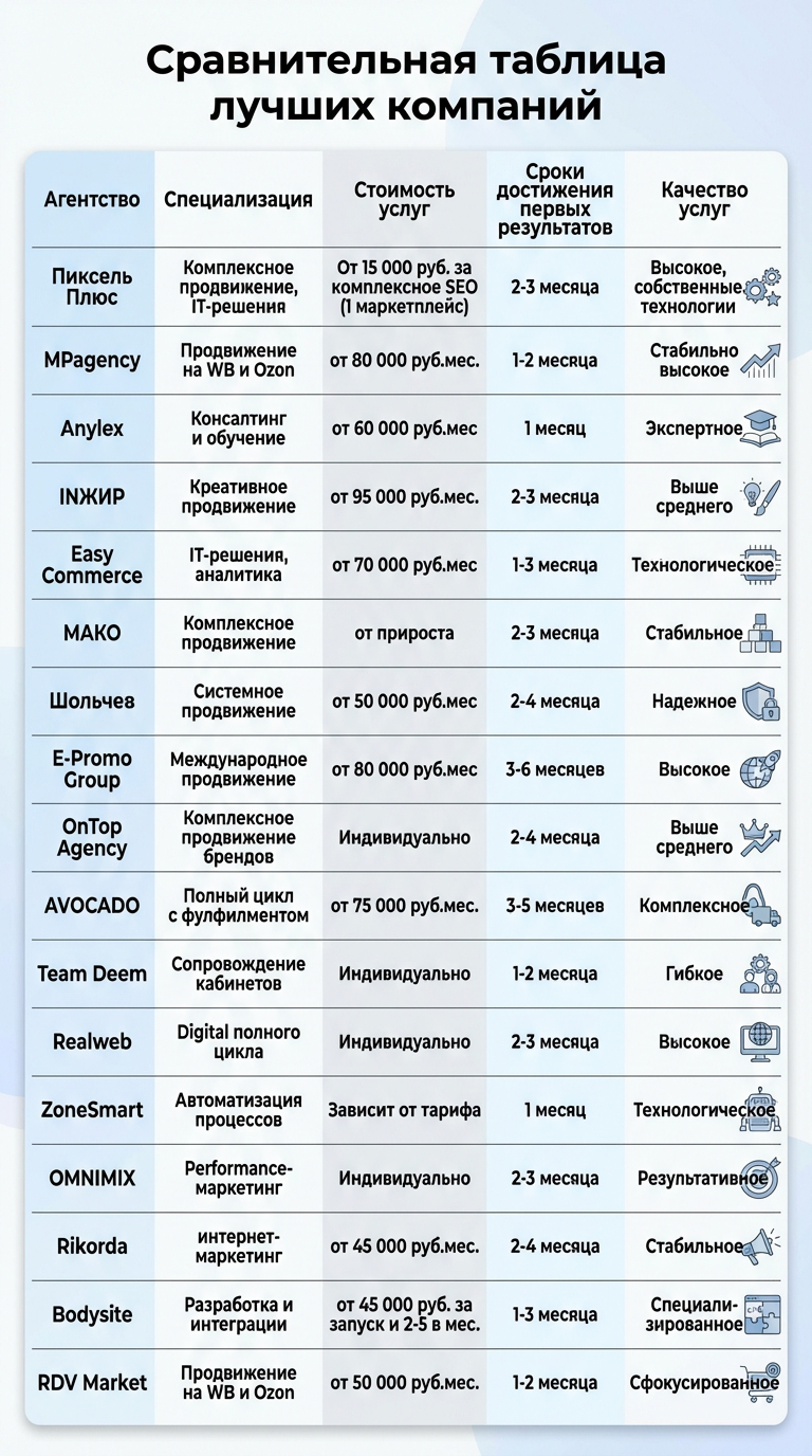 Рынок услуг разнообразен — от крупных игроков полного цикла до узкоспециализированных бюро. Среди комплексных подрядчиков лучшими считаются Пиксель Плюс, Realweb и E-Promo Group. Для решения специфических задач подойдут специализированные агентства: Anylex (обучение и консалтинг), ZoneSmart (автоматизация) или AVOCADO (фулфилмент и логистика).