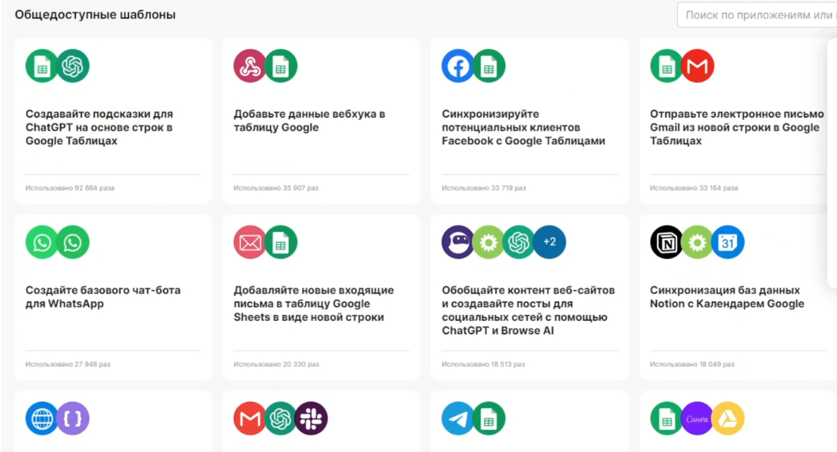 Итак мы видим кучу шаблонов, то есть по сути готовых ботов, которые уже сделаны за нас. Различные связки нейросетей, например бот с встроенным чатджипити, автокомментарии, генерация видео и т.д. Мы можем выбрать любой готовый шаблон или создать свою связку.